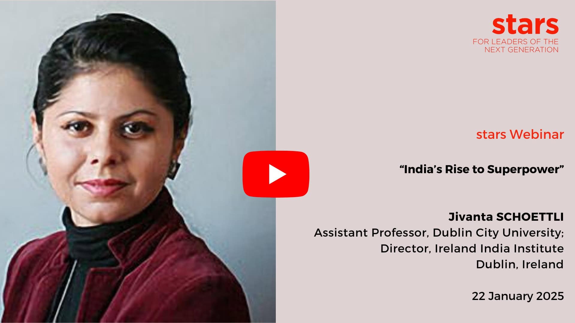 In this 30 minutes stars webinar, Jivanta SCHOETTLI, Assistant Professor, Dublin City University; Director, Ireland India Institute; stars Alumna, Dublin, Ireland, talks about India becoming the 3rd largest economy of the world by 2030 and possibly the second largest economy by 2050, about the domestic challenges and the coalition government of PM Modi, about India’s potential for foreign business and India’s foreign policy. Finally, Jivanta talked about the Global South, BRICS and the impact of the Trump Administration on India.