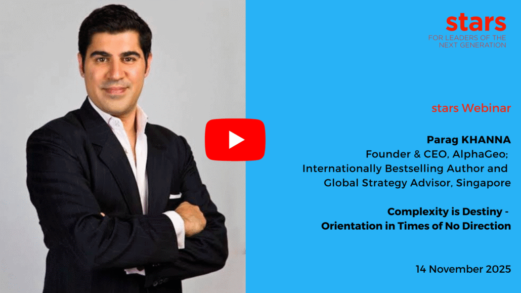 In this 30 minutes stars webinar Parag KHANNA talks about the geopolitical, geoeconomic and geotechnological dynamics in the era of AI, about the global order and the challenges to the multilateral system. He elaborates on his latest study on the Global Investment Risk and Resilience Index and also analyses the present situation in China, including Taiwan. Finally, Parag talked about the impact of these geopolitical developments on the global economy and what advice he has for companies.